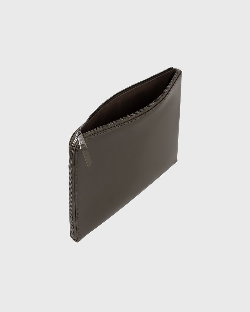 Минималистичный чехол для ноутбука с диагональю 14, на молнии, с внешним карманом на магните. Выполнен из натуральной гладкой кожи цвета хаки, с тиснением лого ABRAU CLUB, на хлопковой подкладке. Пуллер на молнии из темного никеля дополнен гравировкой монограммы АС.