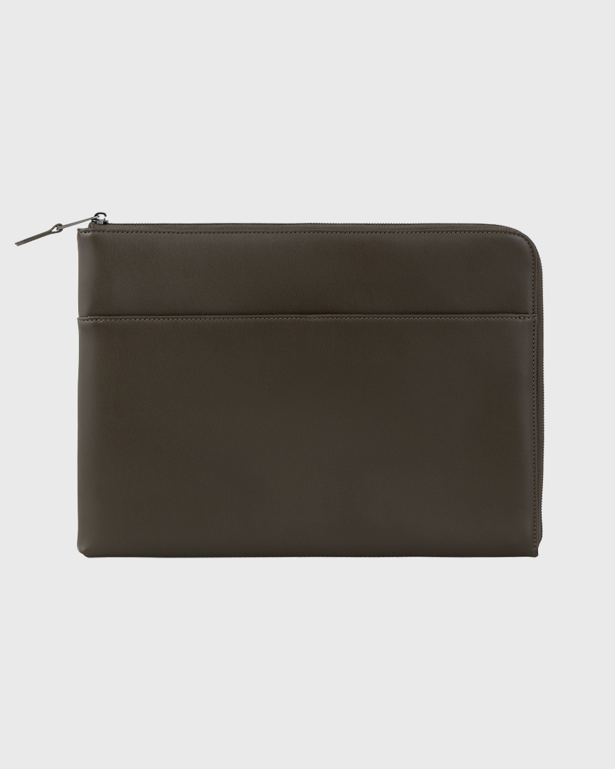 Минималистичный чехол для ноутбука с диагональю 14, на молнии, с внешним карманом на магните. Выполнен из натуральной гладкой кожи цвета хаки, с тиснением лого ABRAU CLUB, на хлопковой подкладке. Пуллер на молнии из темного никеля дополнен гравировкой монограммы АС.