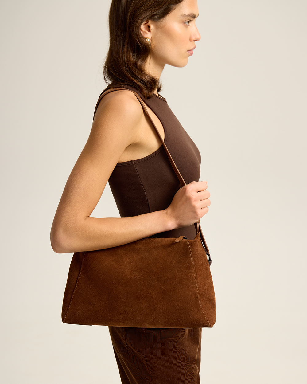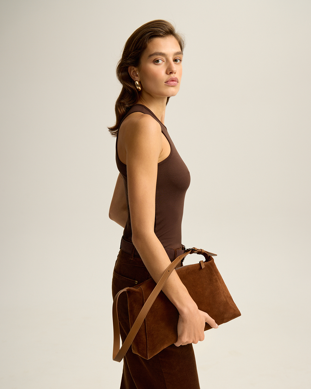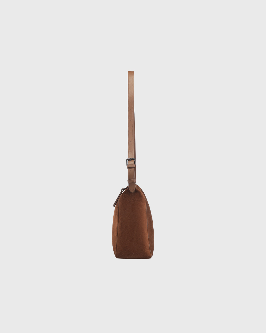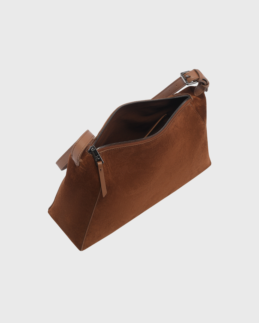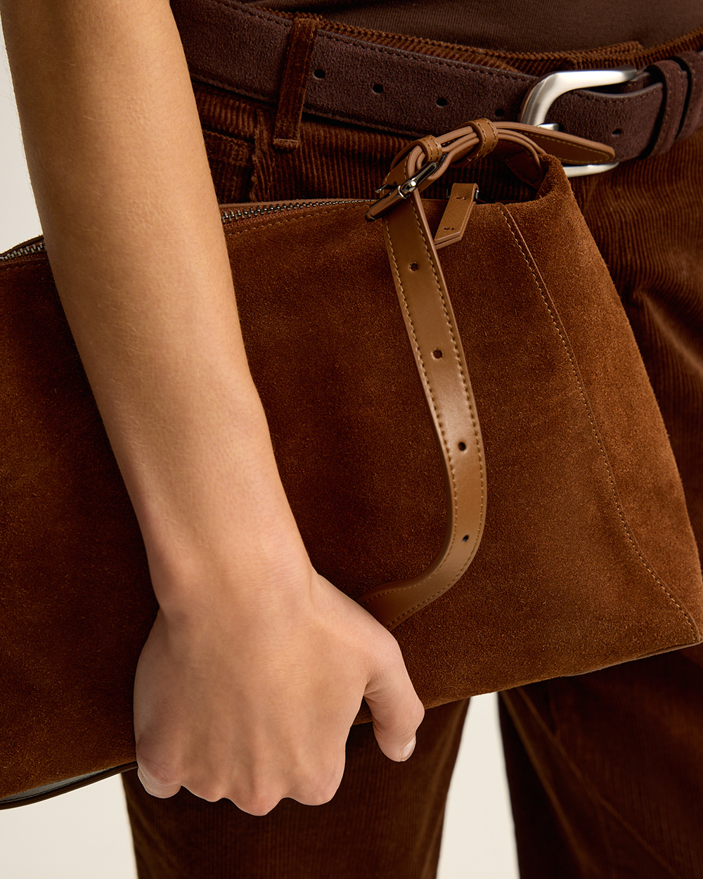 Натуральная замша может окрашивать светлые вещи, особенно во влажную погоду, поэтому ручка-ремень выполнена из гладкой кожи.