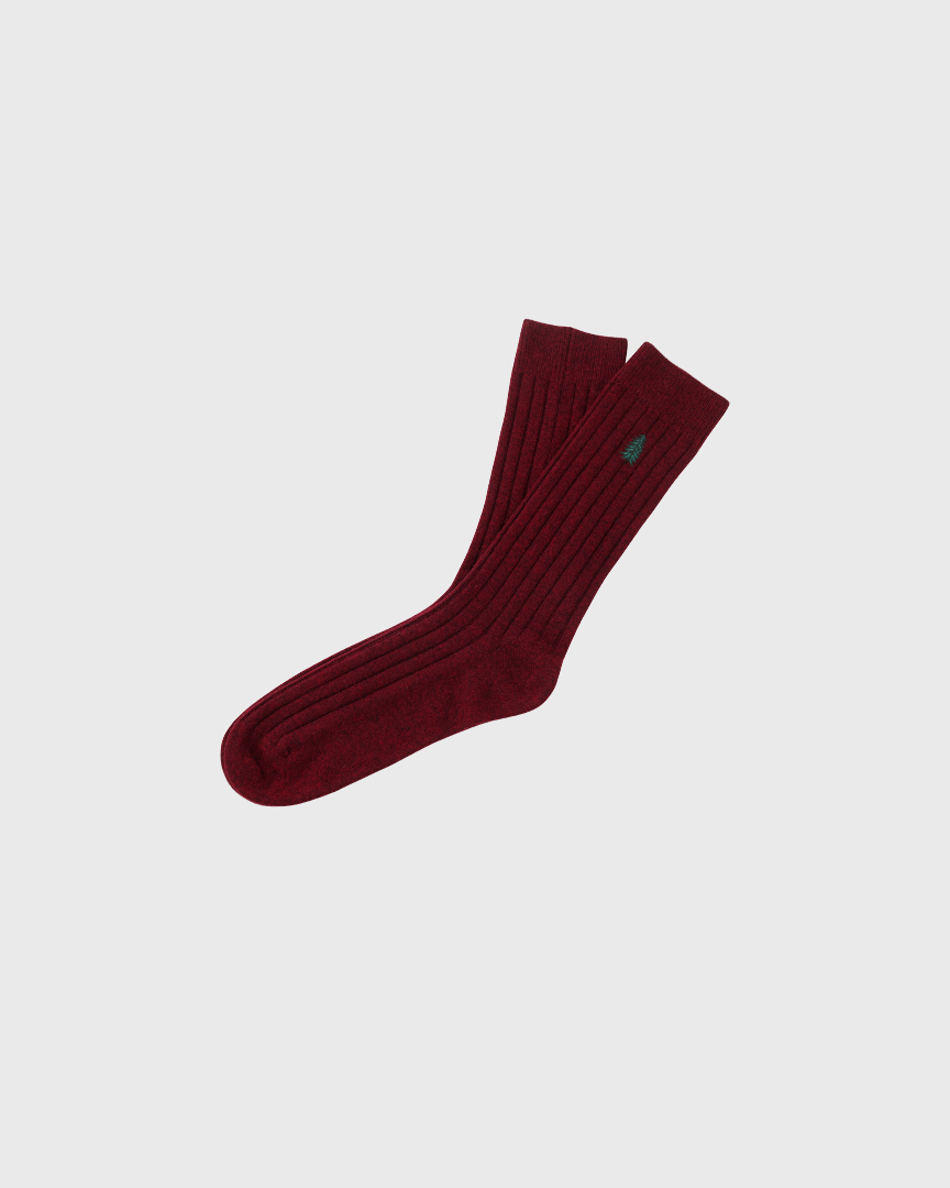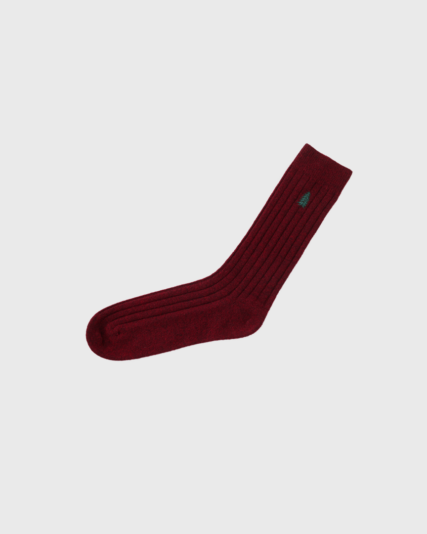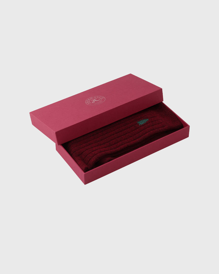 Мягкие, уютные тёплые носки из шерсти с кашемиром первоклассного качества, фирменного винного оттенка, с небольшой новогодней вышивкой “елочка”. Упакованы в фирменную коробку, станут приятным знаком заботы и внимания к близким или к самой себе.