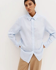 Классическая рубашка объемного кроя со слегка спущенной линией плеча. Широкий отложной воротник, классические манжеты с пуговицами. Прямой силуэт, планка с пуговицами. Комфортная дышащая ткань из 100% хлопка.