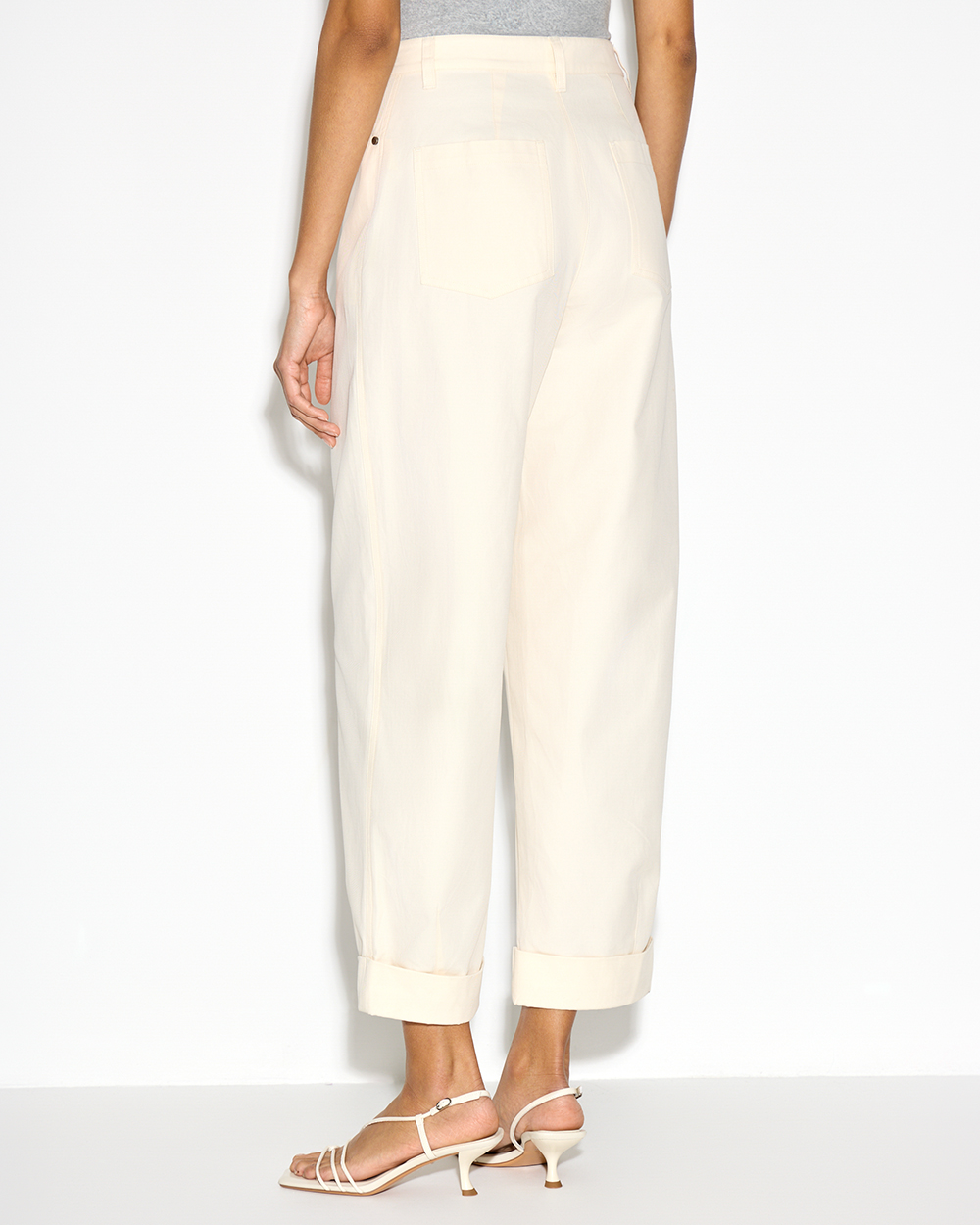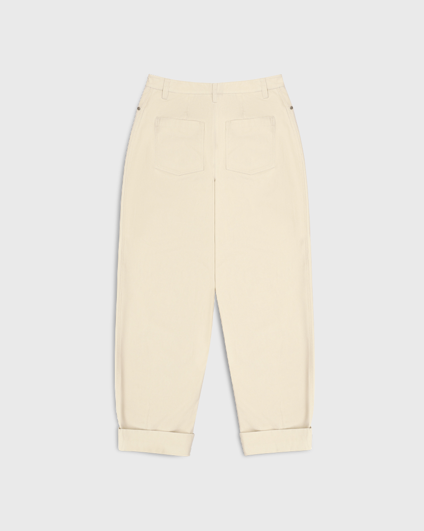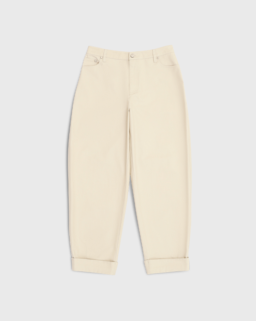 Светлые хлопковые брюки с отворотами — комфортная база с акцентом на форму. Объёмный крой с заужением к низу создает актуальный овальный силуэт, а плотный хлопок держит форму и добавляет структуру.