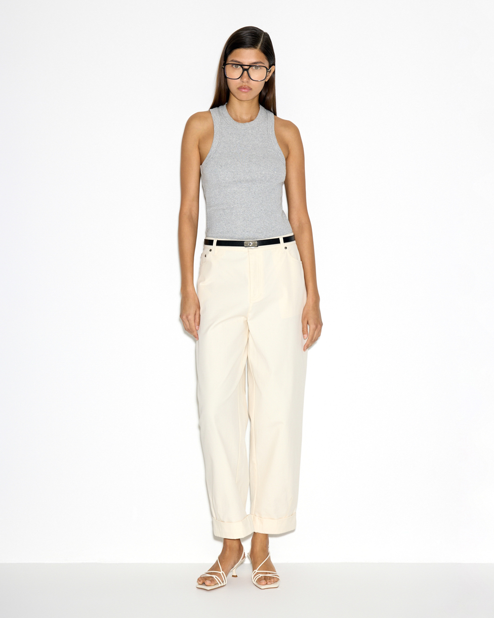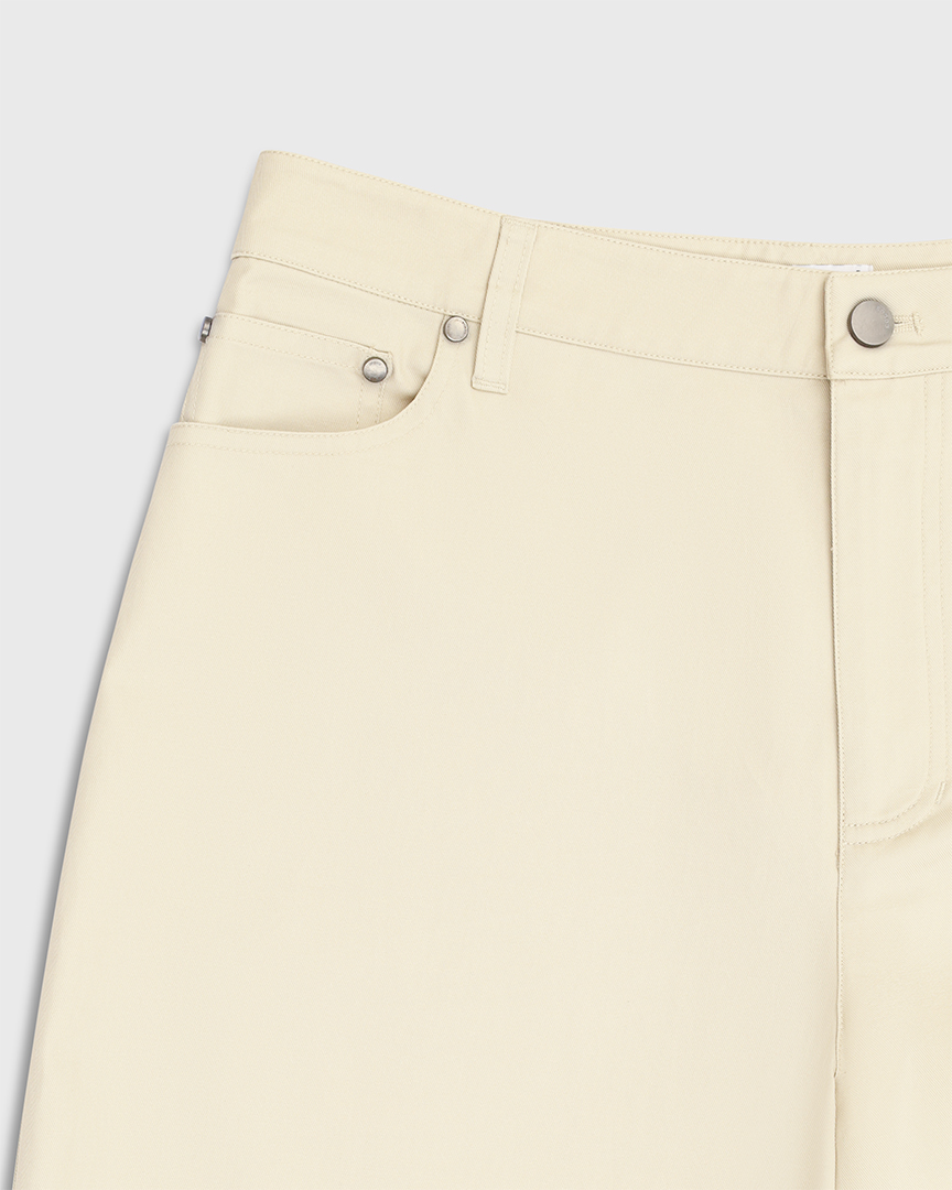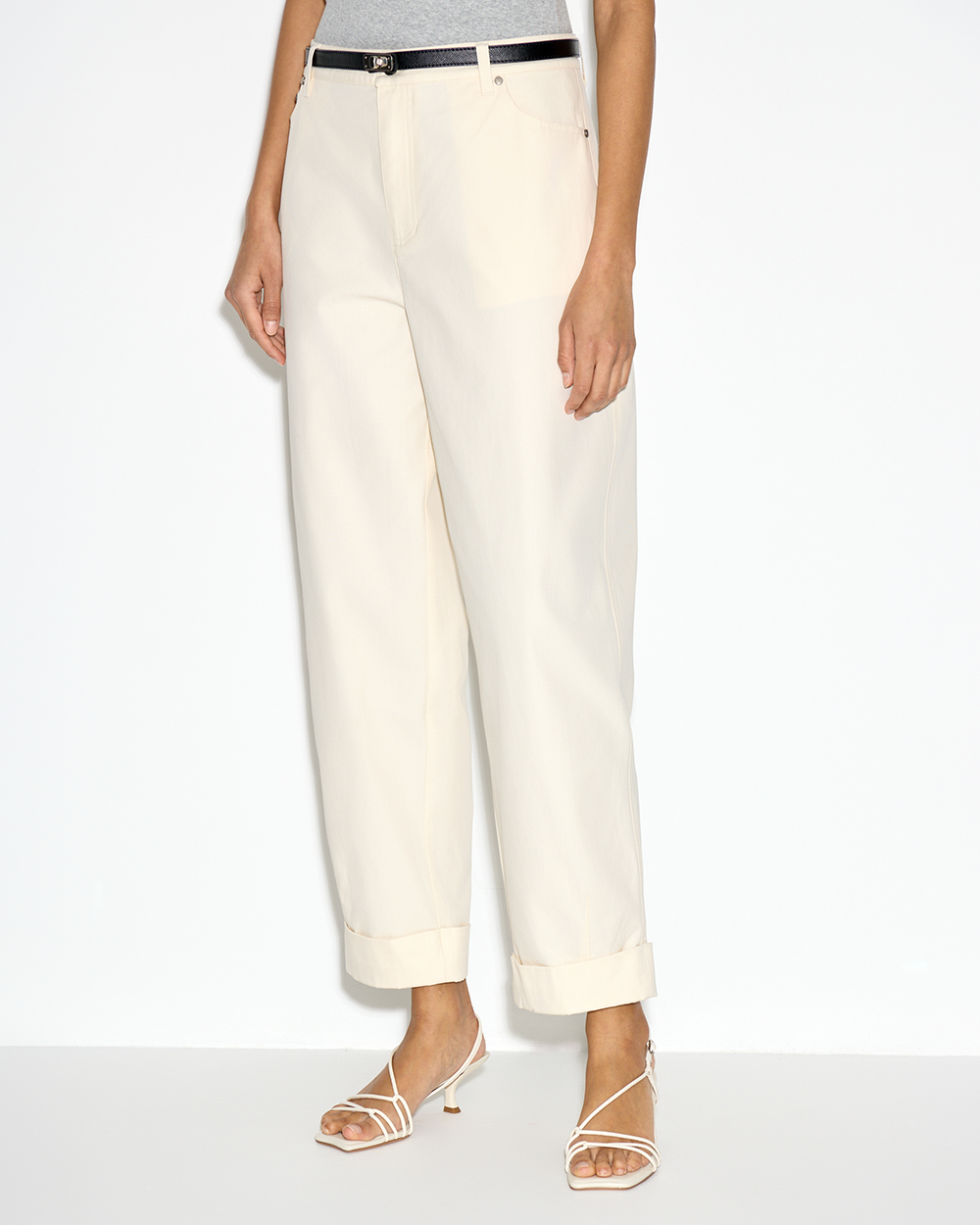 Светлые хлопковые брюки с отворотами — комфортная база с акцентом на форму. Объёмный крой с заужением к низу создает актуальный овальный силуэт, а плотный хлопок держит форму и добавляет структуру.