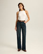 Джинсы прямого кроя с высокой посадкой.  Комфортный деним из 100% хлопка с легким эффектом потертостей. “Скошенные” карманы спереди, карманы сзади.