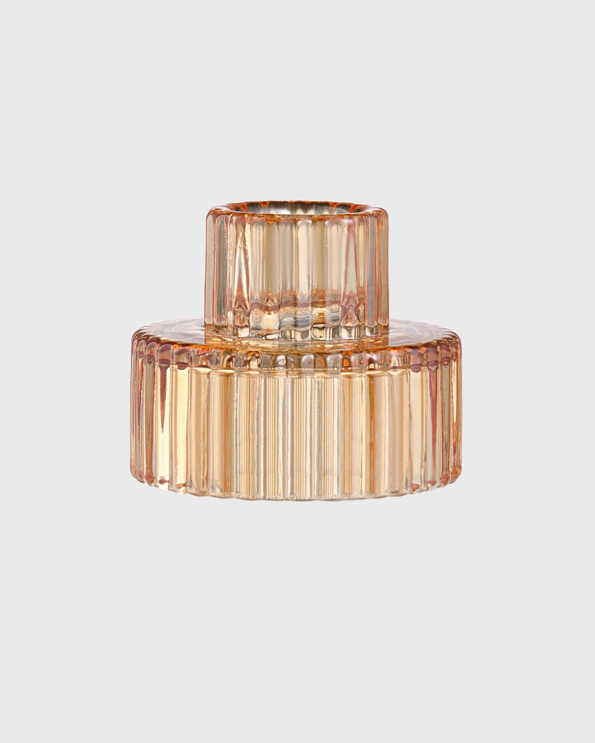 Подсвечник изготовлен из прозрачного стекла в форме вазы с прочным основанием для устойчивости. Поверхность имеет фактурную текстуру.