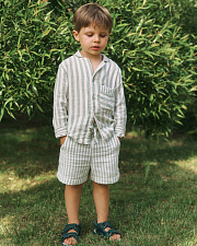 Детская унисекс рубашка в полоску из муслина. Накладный карманы на груди. Отложной воротник, застежка на пуговицы Манжеты на пуговицах.