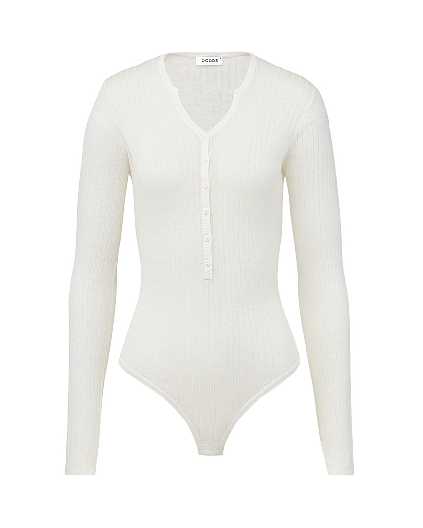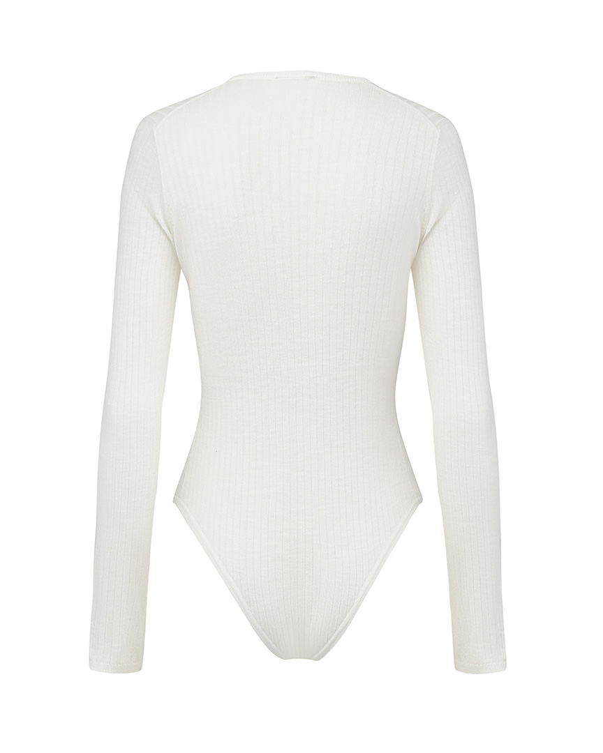 Облегающее боди из тонкого шерстяного трикотажа. Длинные рукава. Застегивается на обтяжные пуговицы на груди и кнопки снизу.