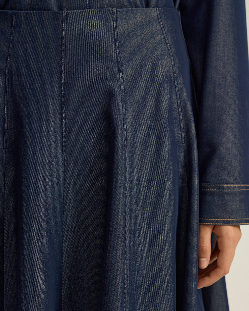 Расклешенная юбка миди из денима с эффектом "сырой" варки. Застежка на молнию. Швы контрастной нитью. Соберите комплект с джинсовой рубашкой из нашей коллекции.