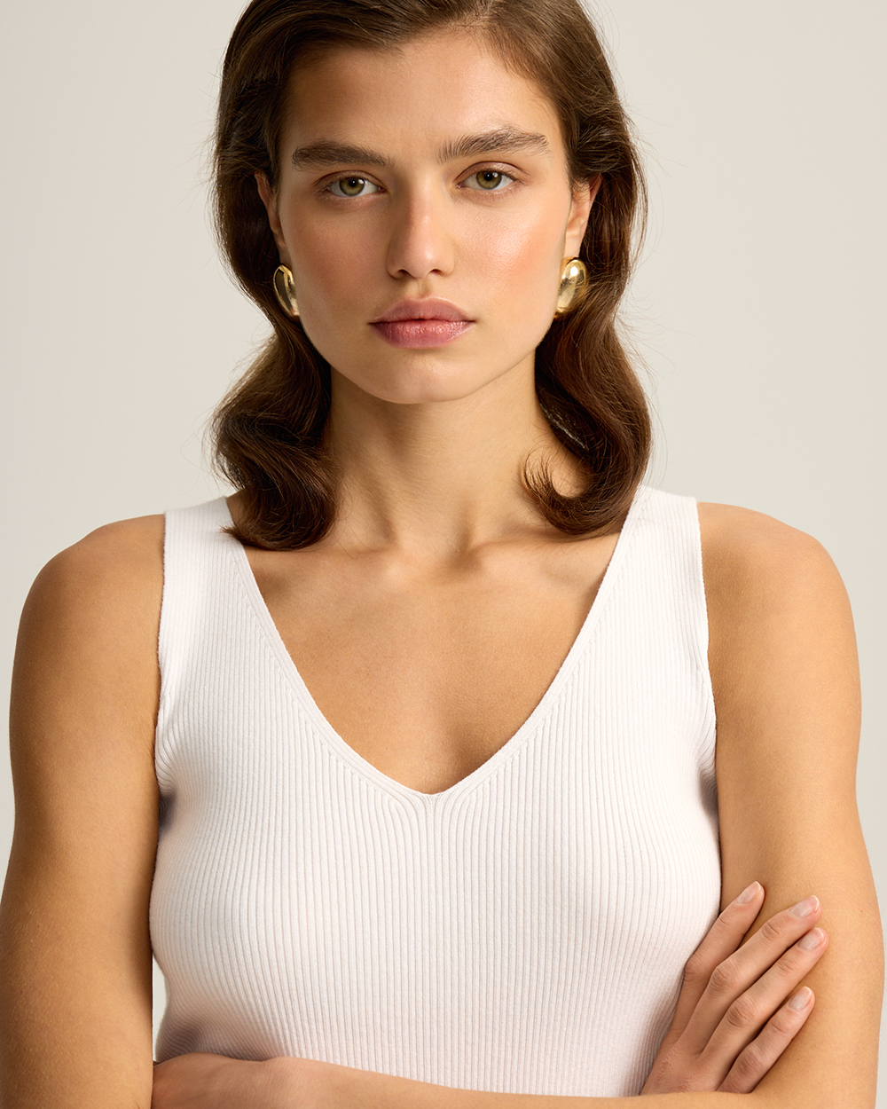 Топ из эластичного вязаного трикотажа в рубчик, из хлопка и вискозы. Приталенный крой, V-образный вырез.