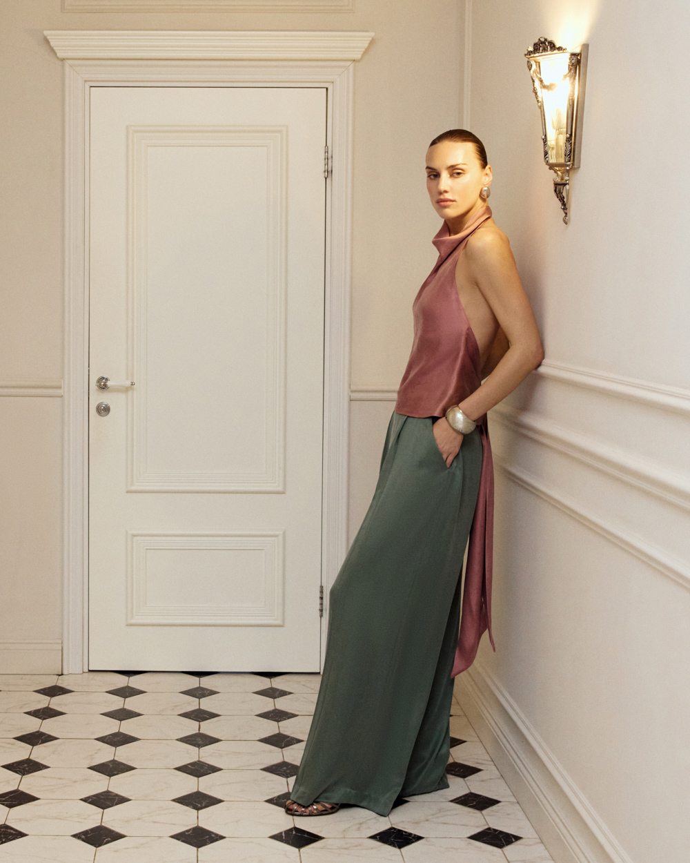 Свободный крой и бархатистая ткань с эффектом легкого напыления создают основу для эффектного элегантного образа. Спереди удобные карманы, боковая молния аккуратно скрывается. Комфортный материал — благородный купро с районом.