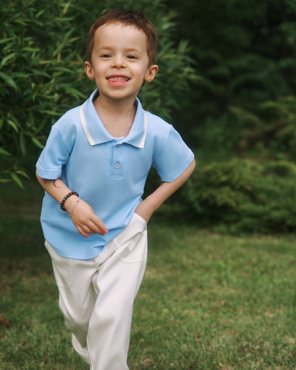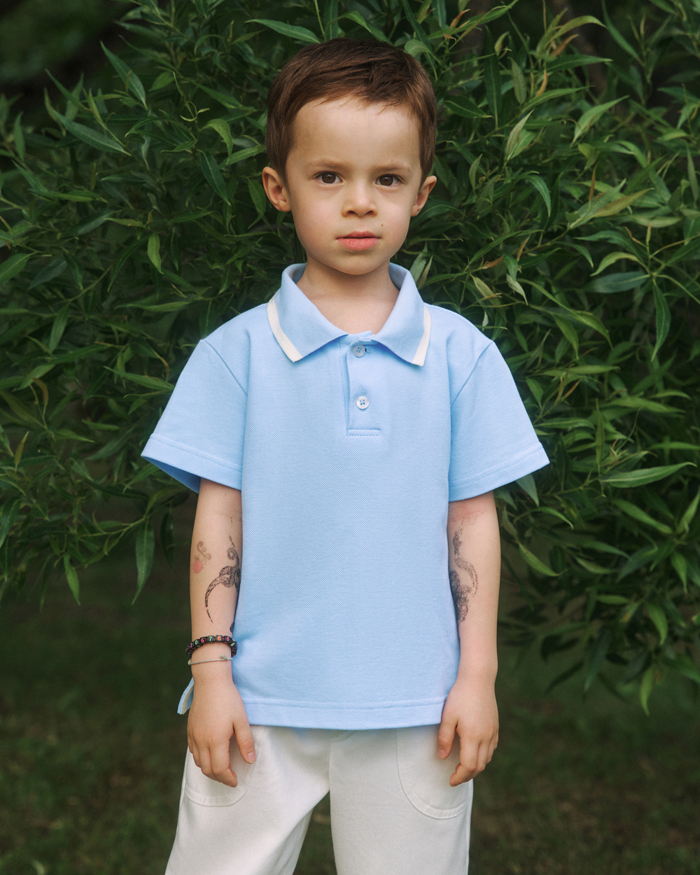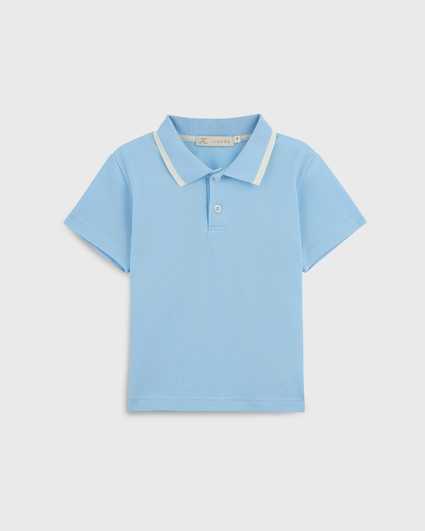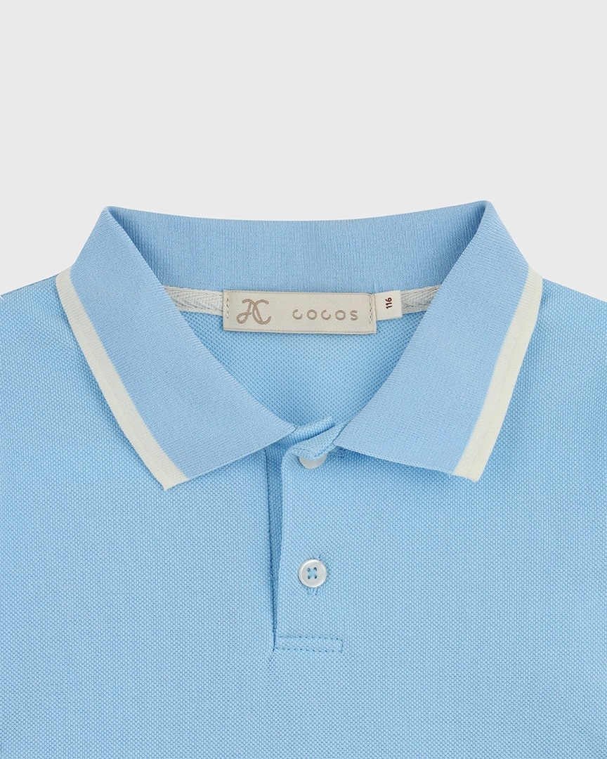 Детская футболка-поло унисекс из эластичного хлопкового пике́ с контрастными полосками на воротнике. Отложной воротник. Короткие рукава. Застежка на пуговицы на планке.