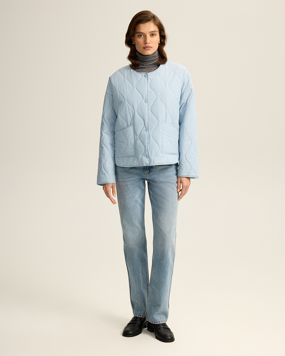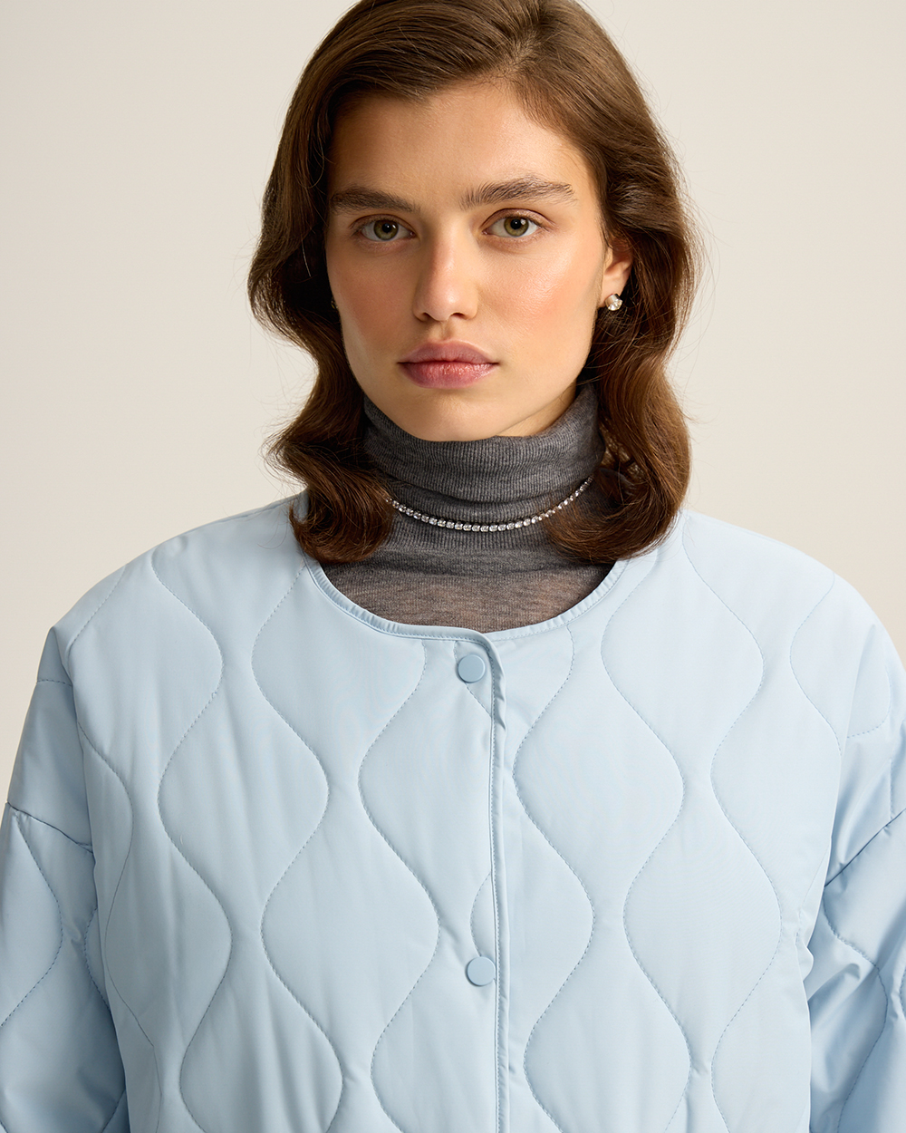 Стеганая куртка, с защитой от влаги. Отличный вариант верхней одежды на межсезонье. Изделие с подкладкой и слоем утеплителя из синтепона. Застежка на кнопки в тон изделия. Накладные передние карманы.
