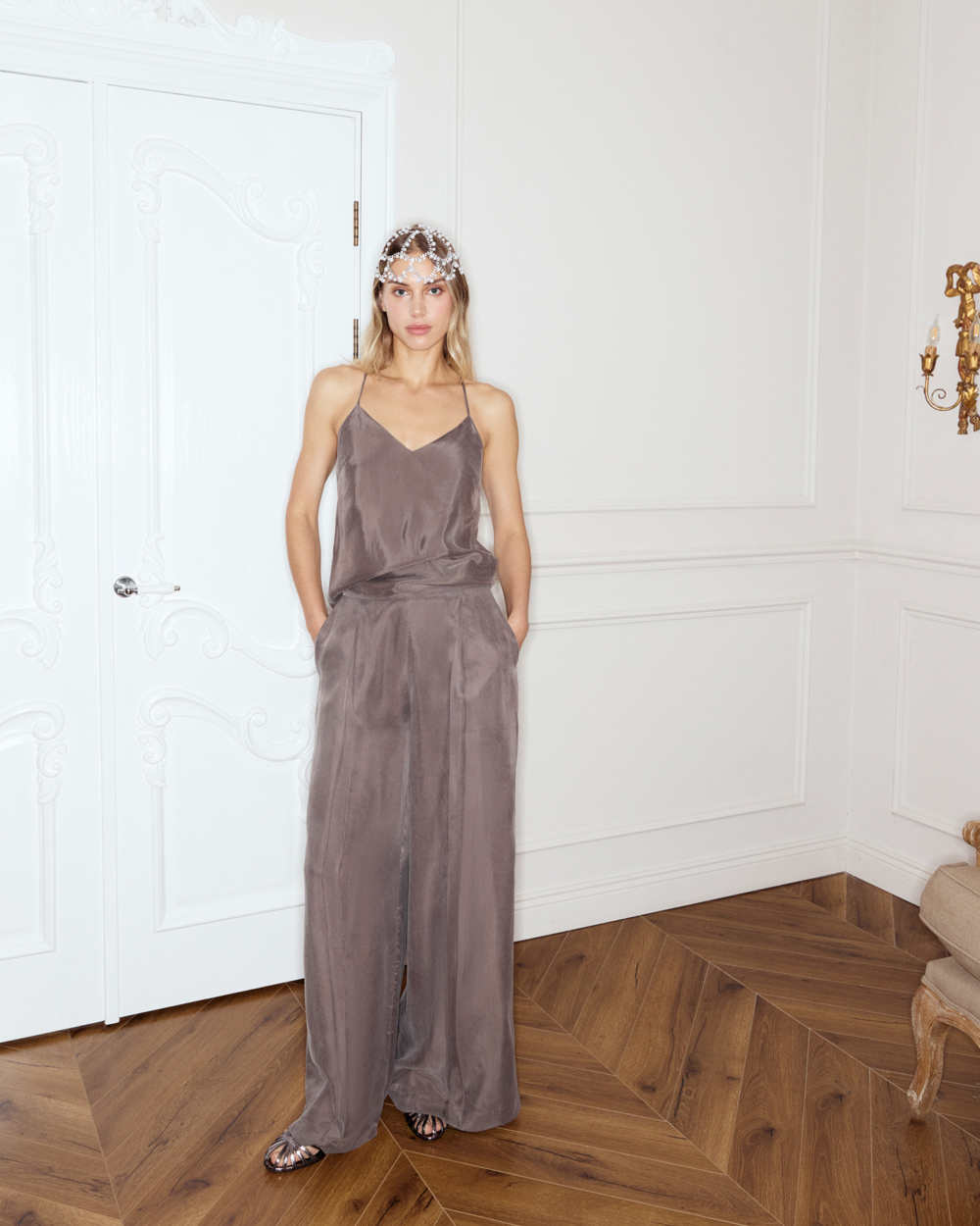 Топ на тонких перекрестных бретелях с V-образным вырезом. Бархатистая текстура ткани создает красивые переливы цвета, особенно в вечернем освещении.