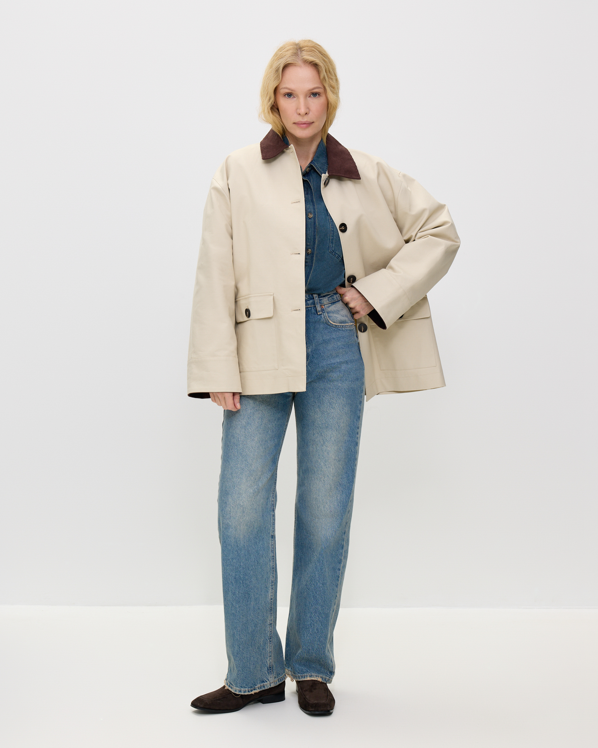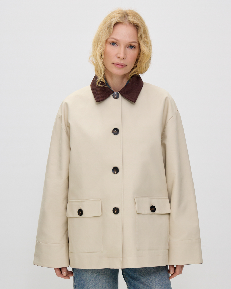 Куртка из хлопка. Прямой силуэт. Отделка контрастным темно-коричневым вельветом на отложном воротнике и на рукавах с внутренней стороны. Передние карманы с застежкой на пуговицы. Застежка на контрастные пуговицы.